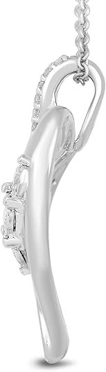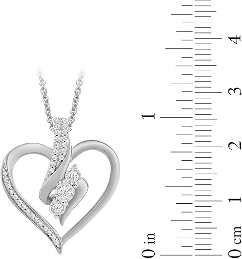 - Sterling silver necklace featuring 0.25 cttw diamond-accented open heart pendant with hanging trio of 0.25 cttw diamonds at center