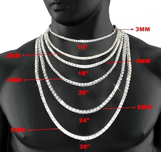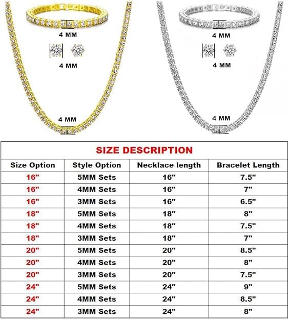 - Style and Design: Classical Bling Cz diamond tennis chain necklace designs, which made with incredible details and craftsmanship.Gold and silver plated diamond chain necklaces in multiple Sizes: Width 3mm/4mm/5mm and lengths16″/18″/20″/22″/24″/30″; More options by 1 row tennis chains, tennis necklace bracelet earring sets, tennis and cuban link and cz chain sets.