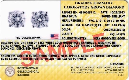 - IGI CERTIFIED 1 CARAT LAB GROWN DIAMOND – 1 carat total weight lab grown shinny D-E color and VS1-VS2 clarity diamonds add a touch of elegance to any outfit with these stunning 1 carat total weight lab grown diamond studs. With a round brilliant cut, these lab grown stones truly sparkle and shine